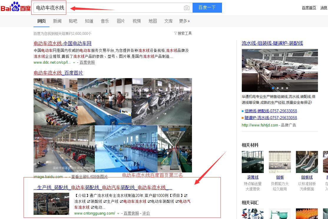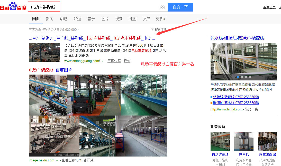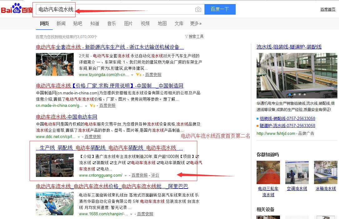 “電動(dòng)車裝配線”百度首頁第一名,請看下方截圖 ,“電動(dòng)車流水線”,“電動(dòng)汽車流水線”,“電動(dòng)汽車裝配線”,等等,很多關(guān)鍵詞都在百度首頁,請看如下截圖,有圖為證。在此特意感謝臺(tái)州SEO(通盛網(wǎng)絡(luò))人員為我公司網(wǎng)站所做的付出與努力